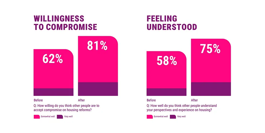 Interestingly, the biggest swing for renters' rights came from an unlikely source - participants who owned investment properties. They changed their mind after hearing the evidence on international comparisons and talking to renters in the room.